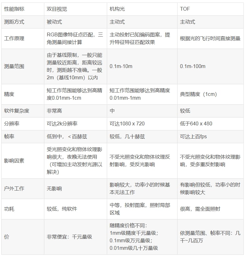 首页 动态 目前主流3D视觉技术各有什么优劣势?如何选择最Match的工业3D相机? 目前主流3D视觉技术各有什么优劣势?如何选择最Match的工业3D相机? 技术科普 2024-08-12 浏览量:1984 什么3D相机?3D相机与2D相机相比有什么差别? 3D相机,也被称作深度相机,与传统的2D相机相比,它能够多获取物体到相机的距离信息,即深度信息,结合2D图像的X和Y坐标,可以计算出每个点的三维坐标,从而实现三维重建、目标定位、导航避障等功能。 3D机器视觉可以完成许多2D机器视觉无法完成的任务。 以零件检测为例,下图零件表面有一划痕、边沿有凹陷。传统的2D机器视觉只能依靠表面图像颜色的不连续来判断是否缺陷,但此案例中,缺陷和零件表面反光颜色接近,判断难度很大,3D相机可以得到表面凹凸的深度信息,从而准确的判定划痕和边缘的凹陷。 此外,目前3D视觉技术在高精度检测、高精度测量(例如弯管、不规则件)、智能分栋、装配(引导机械臂在三维空间内避障和定位)、物流车导航等更多场景中实现了相较于2D机器视觉更为广泛的应用覆盖。 主流3D技术对比 3D相机的工作原理主要有三种技术:双目立体视觉、结构光和ToF(Time of Flight),还有其他市面上常见和新技术发展起来的相机种类。 1. 双目立体视觉基于视差原理并利用成像设备 从不同的位置获取被测物体的两幅图像,通过计算图像对应点间的位置偏差来获取物体三维几何信息。 一般立体视觉相机指的是被动式双目立体视觉相机,而主动式双目立体视觉相机是在双目立体视觉的基础上,增加了主动发射光源(通常是红外光)来辅助获取深度信息的相机系统,这种系统结合了被动双目视觉和主动发射光源的优势。 1. 被动式双目立体视觉相机 【优点】1)硬件要求低,功耗低,成本低。普通 CMOS 相机即可; 2)室内外都适用,尤其适合在户外工作; 3)适用于纹理丰富的场景。 【缺点】1)对环境光照非常敏感。光线变化导致图像偏差大,进而会导致匹配失败或精度低; 2)不适用单调缺乏纹理的场景。双目视觉根据视觉特征进行图像匹配,没有特征会导致匹配失败; 3)计算复杂度高。该方法是纯视觉的方法,对算法要求高,计算量较大; 4)基线限制了测量范围。测量范围和基线(两个摄像头间距)成正比,导致无法小型化。 2. 主动式双目立体视觉相机 通常是指在双目立体视觉的基础上,增加了主动发射光源(如红外光)来辅助获取深度信息的相机系统。这种系统结合了被动双目视觉和主动发射光源的优势。国内米兰·(milan)智能是研究该领域的专业企业。 【优点】1)低光场景可用:可在户外使用,同时也可在低光或无光环境工作,提高图像可见度和深度测量准确性; 2)增强纹理信息:为缺乏纹理的表面增加必要纹理信息,适合表面光滑和颜色单一场景; 3)降低环境光干扰:使用红外或特定波长的光源可以减少环境光变化对系统性能的影响。 【缺点】1)功耗增加:使用外部光源可能会增加系统的功耗,尤其是在需要长时间运行的应用中。 2)安装和校准:需要更精确的安装和校准过程,以确保光源和相机之间的正确对齐。 结构光 通过近红外激光器,将具有一定结构特征的光线投射到被拍摄物体上,再由专门的红外摄像头进行采集。这种具备一定结构的光线,会因被摄物体的不同深度区域,而采集不同的图像相位信息,然后通过运算单元将这种结构的变化换算成深度信息,以此来获得三维结构。 根据编码图案不同一般有:条纹结构光、编码结构光、散斑结构光。 【优点】1)方案成熟,相机基线可以做的比较小,方便小型化。 2)资源消耗较低,单帧 IR 图就可计算出深度图,功耗低。 3)主动光源,夜晚也可使用。 4)在一定范围内精度高,分辨率高,分辨率可达 1280x1024,帧率可达 60FPS。 【缺点】1)容易受环境光干扰,室外体验差。 2)随检测距离增加,精度会变差。 TOF 顾名思义是测量光飞行时间来取得距离,具体而言就是通过给目标连续发射激光脉冲,然后用传感器 接收从反射光线,通过探测光脉冲的飞行往返时间来得到确切的目标物距离。 因为光速激光,通过直接测光飞行时间实际不可行,一般通过检测通过一定手段调制后的光波的相位偏移来实现。 TOF 法根据调制方法的不同,一般可以分为两种:脉冲调制(Pulsed Modulation)和连续波调制 (Continuous Wave Modulation)。 脉冲调制需要非常高精度时钟进行测量,且需要发出高频高强度激光,目前大多采用检测相位偏移办法来实现 TOF 功能。简单来说就是,发出一道经过处理的光,碰到物体以后会反射回来,通过捕捉来回的时间计算距离。 【优点】 1)检测距离远:在激光能量够的情况下可达几十米。 2) 受环境光干扰较小。 【缺点】 1)对设备要求高,特别是时间测量模块; 2)资源消耗大。 该方案在检测相位偏移时需要多次采样积分,运算量大。 3)边缘精度低。 4)限于资源消耗和滤波,帧率和分辨率都没办法做到较高。 三种技术性能对比 上一个:【最全选型攻略】挑选合适的工业相机,必须提前考虑12要素! 返回列表 下一个:3D机器视觉可以完成许多2D机器视觉无法完成的任务。 更多新闻推荐 端到端 更易用丨米兰·(milan)®散料运输动态监测与预警系统全新上市 新品上市 2025-02-20 小尺寸 更灵活丨米兰·(milan)3D相机PEA020-800-Y80S上新,助力多场景智造升级 新品上市 2024-09-29 【最全选型攻略】挑选合适的工业相机,必须提前考虑12要素! 工业相