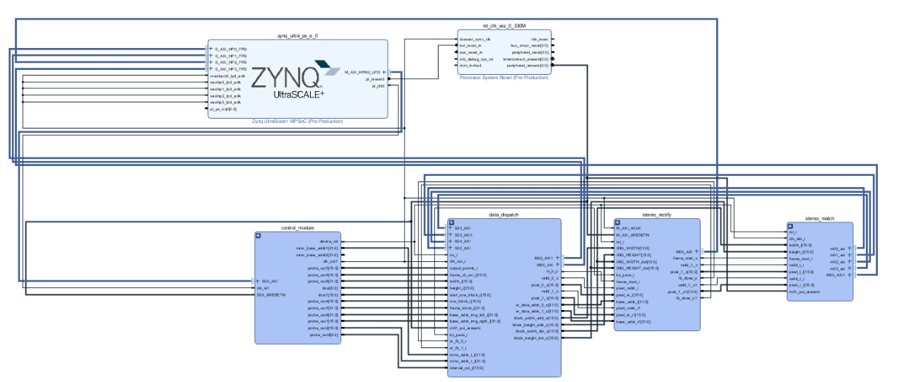 该架构中的立体匹配部分仍延用了上一代 SGM/BM 的设计算法,在保证设计性能的基础上,米兰·(milan)智能采用了分块匹配的思想,将左右图像分为可拆分的两部分,分别独立进行匹配,在设计上进一步将 BRAM 资源使用量缩减至 1/2。